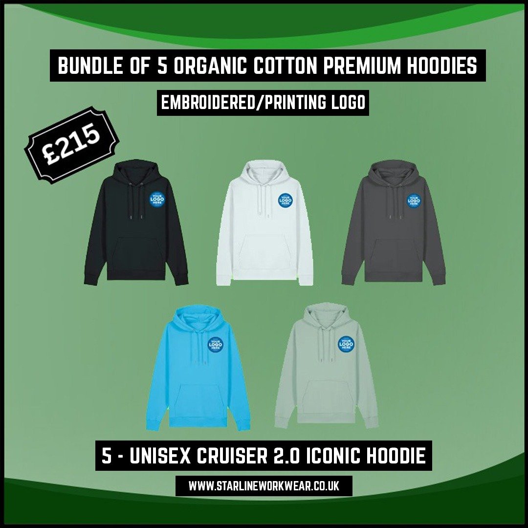 Upgrade your wardrobe or brand offering with this bundle of 5 Unisex Cruiser 2.0 Premium Hoodies – crafted from 100% organic combed cotton for unbeatable comfort, sustainability, and style.