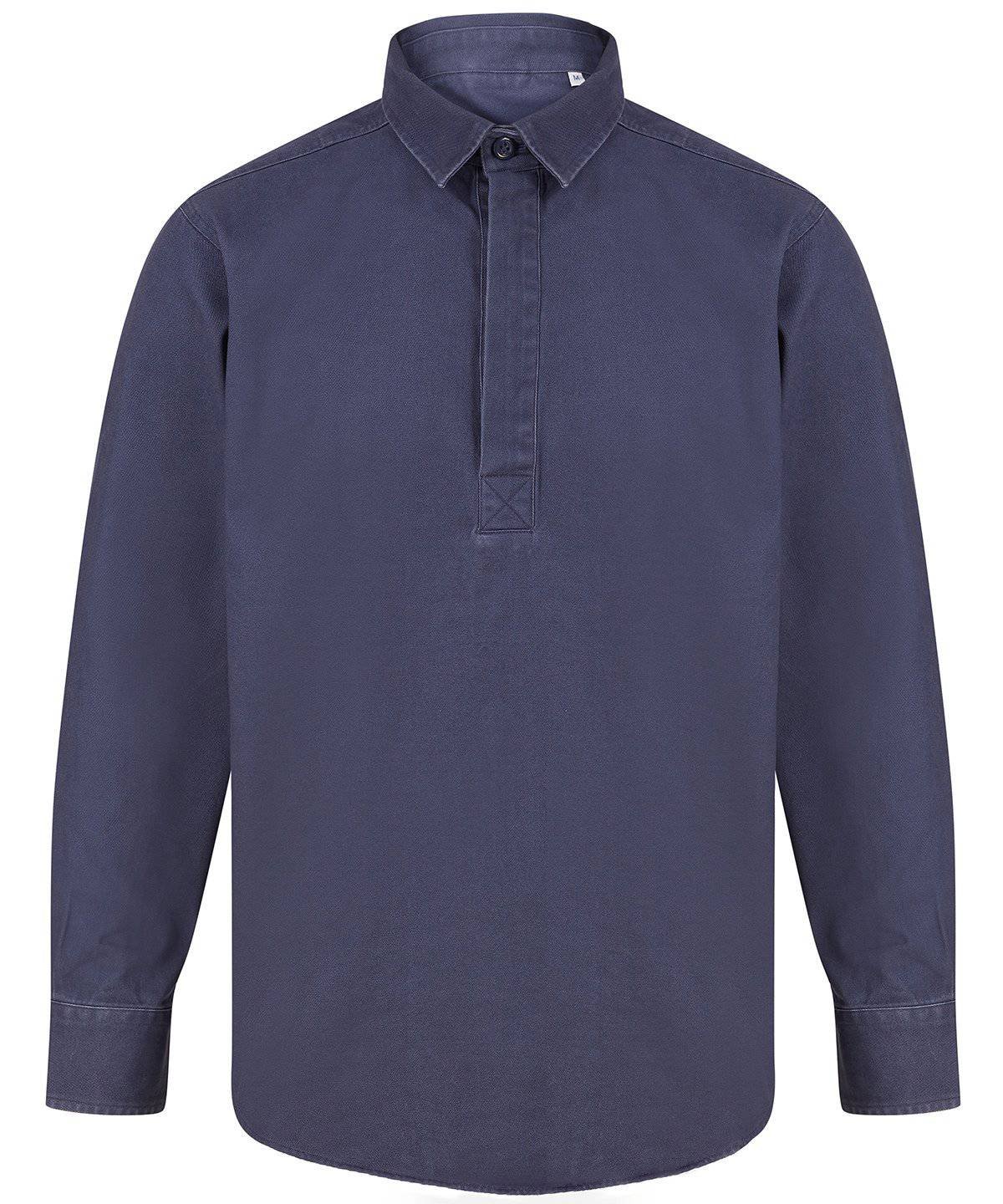 Long-sleeved plain drill shirt. Pullover with concealed button fastenings. Heavy garment wash. Adjustable button cuff and placket. Shaped hem. Back neck hanging loop. Back neck buggy. Self-fabric vent inserts. Tag-free for easy rebranding. SEDEX certified. BSCI certified.