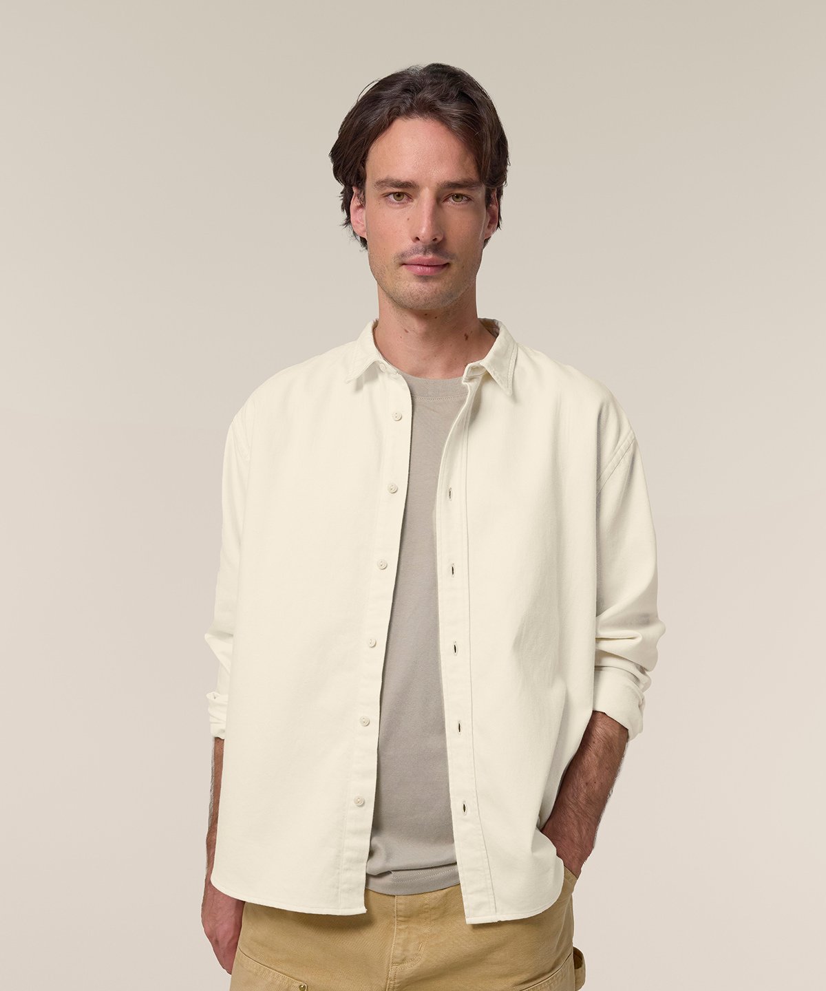 The Worker shirt. Relaxed unisex fit. Point collar with single-needle topstitches. Collar stand. Front placket with single-needle topstitches on each side. Forwarded shoulder. Back yoke. Inside yoke in self-fabric. Set-in sleeves. Sleeve placket with one button. Cuff with two buttons. Rounded cuff corners. Double pleats at cuff seam. Garment-Dyed Black Rock colour has a faded look on all seams due to garment washing. Garment-dyed product, so each garment may vary in appearance and colour may bleed follow our care label. Read print recommendations carefully.